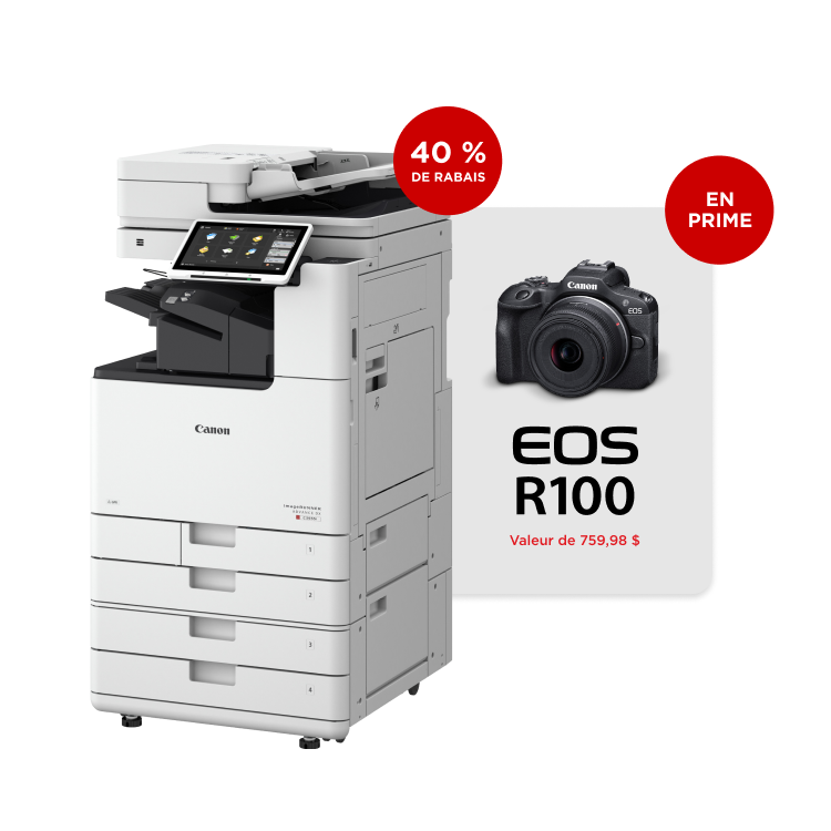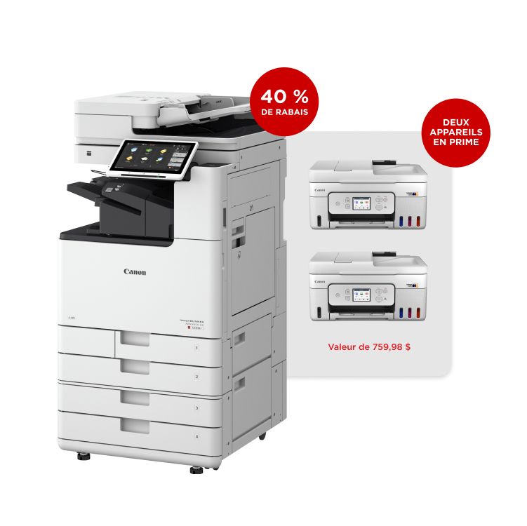 Les petites entreprises admissibles peuvent obtenir un rabais de 40 % sur les copieurs sélectionnés de Canon, en plus de deux imprimantes de bureau G4280 à réservoir MegaTank remplissable en prime (valeur de 759,98 $)**.