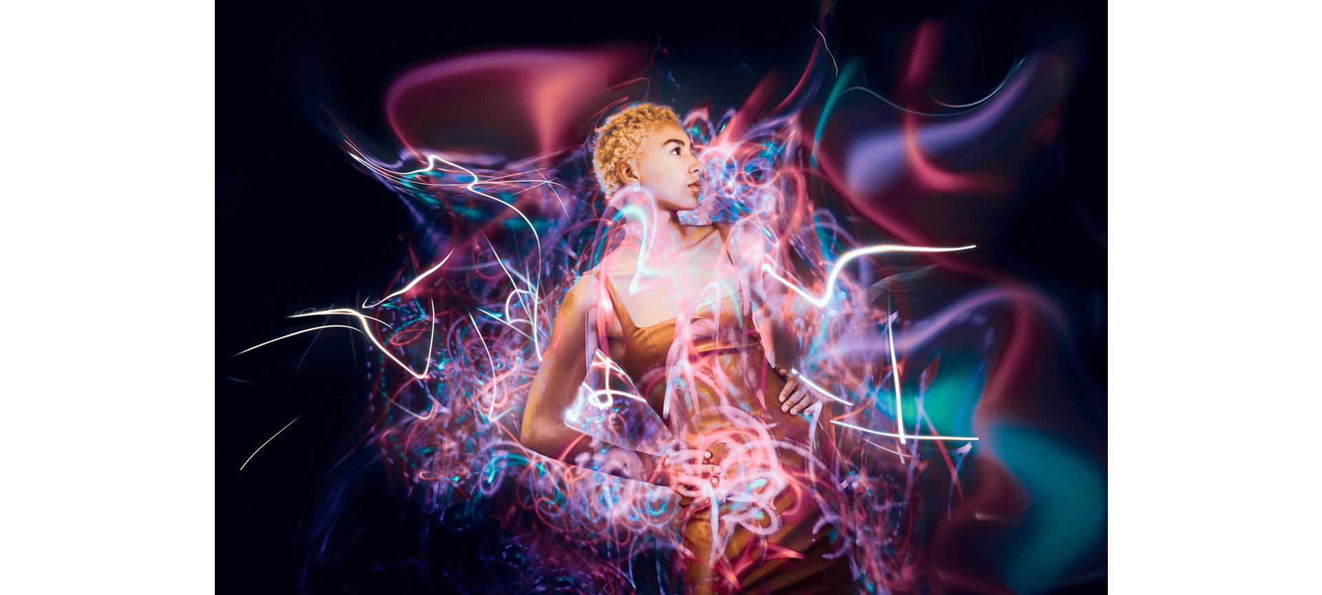 Le mariage entre peinture à la lumière et portraits créatifs est devenu très populaire sur les réseaux sociaux. Photo prise avec un appareil photo EOS R6 de Canon équipé d’un objectif RF 24-105 mm f/4-7, 1 IS STM de Canon à 44 mm, 13 s, f/16 et ISO 100.